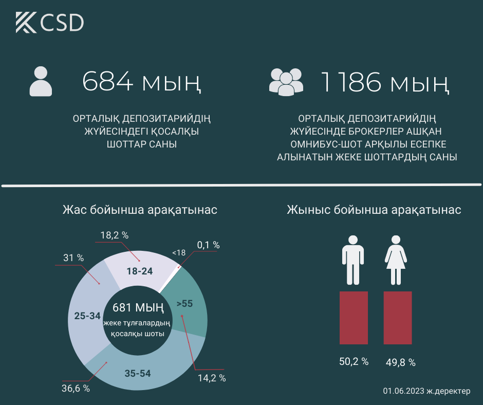 Қазақстандық инвестордың портреті жас түрінде қалып отыр. 2023 жылғы 1 маусымдағы жағдай бойынша 25-34 жас аралығындағы бөлшек инвесторлар тобы бөлшек инвесторлардың жалпы санының 31%, 18-24 жас аралығындағылар – 18,2% құрады, бірақ бірнеше ай ішінде 18 жасқа дейінгі жас тобы бойынша көрсеткіш аз болды, алайда ол қысқарып, жылдың басындағы жағдай бойынша 0,06 %-пен салыстырғанда, небәрі 0,04% құрайды.