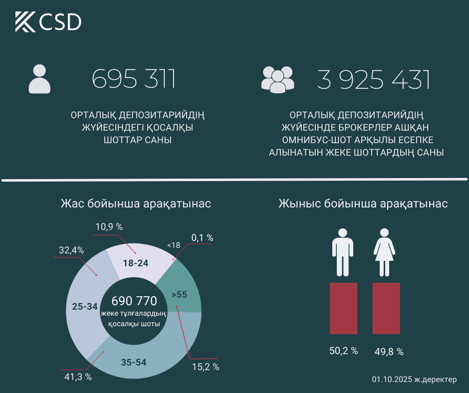 2025 жылғы қыркүйекте Орталық депозитарийдің номиналды ұстау жүйесіндегі шоттардың жалпы саны 161 174 немесе 3,6 % өсті. Өсім омнибус-шоттар арқылы есептелетін ұстаушылардың брокерлік шоттарына түседі.