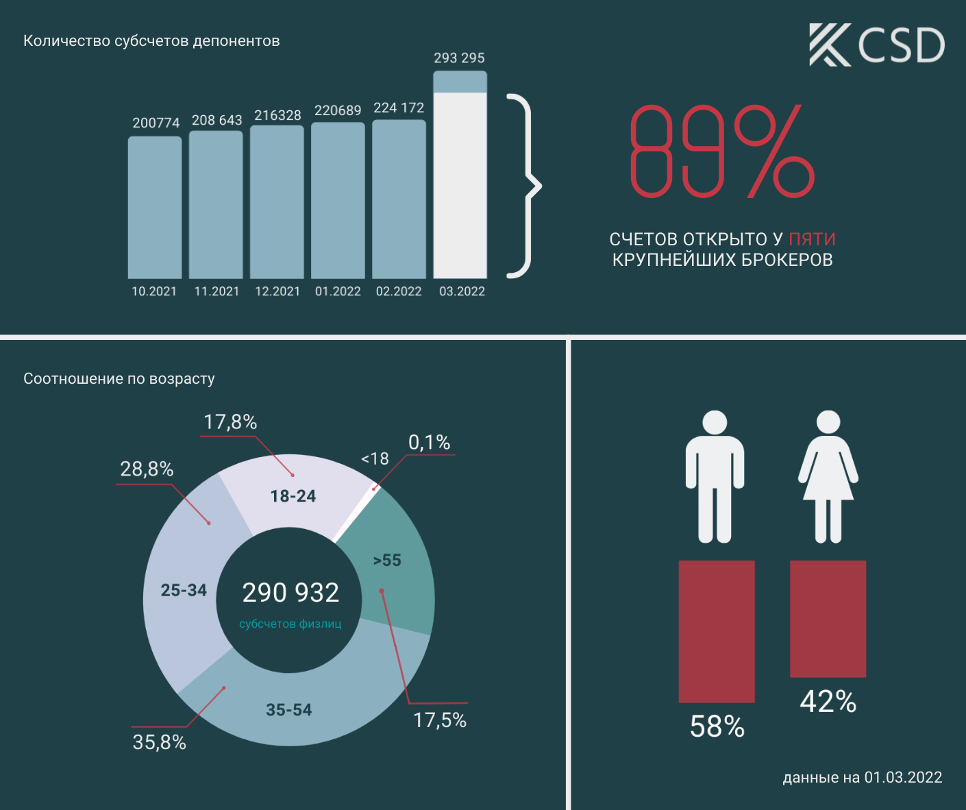 В феврале количество субсчетов, зарегистрированных в системе учета Центрального депозитария превысило 293 тысячи. Это на 30,8 % больше январских показателей. Для сравнения, за все второе полугодие 2021 года число субсчетов выросло всего на 18,9 %. Большая часть субсчетов открыта на имя физических лиц. Их число с первого февраля выросло на 69 тысяч.